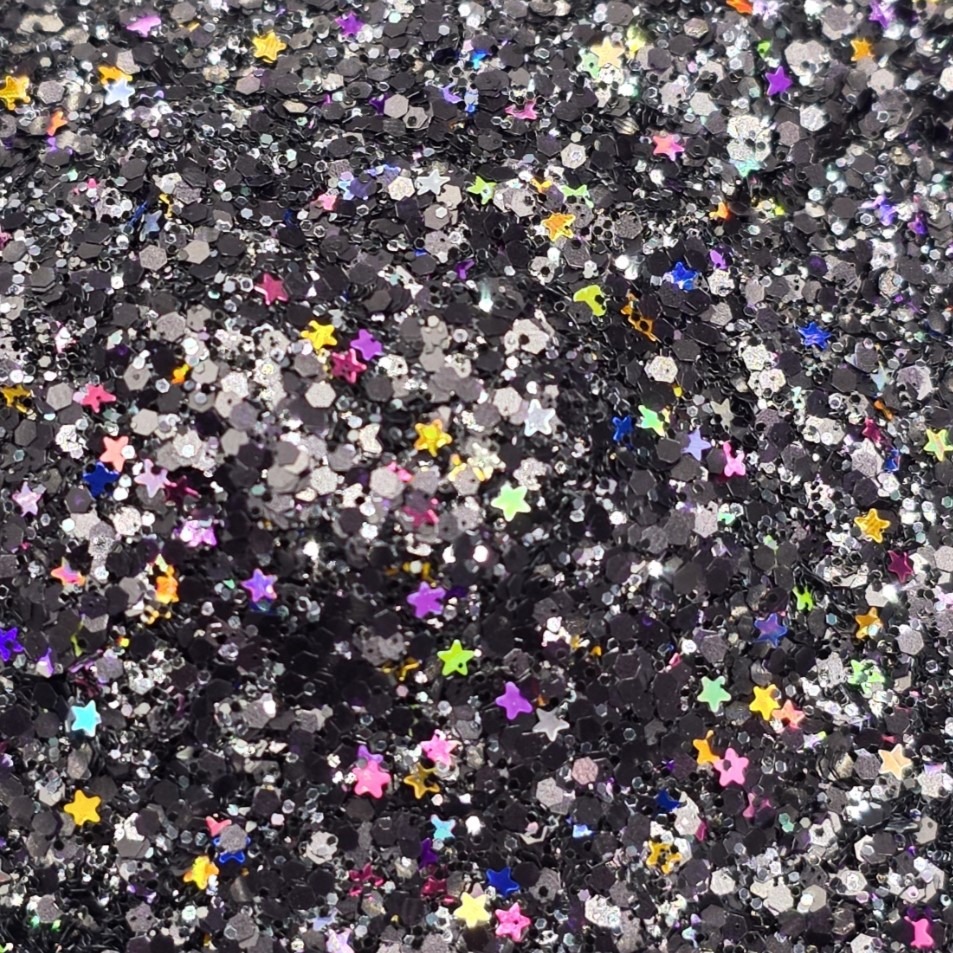 Custom Mini Mix with a black base and a rainbow of tiny holographic stars,