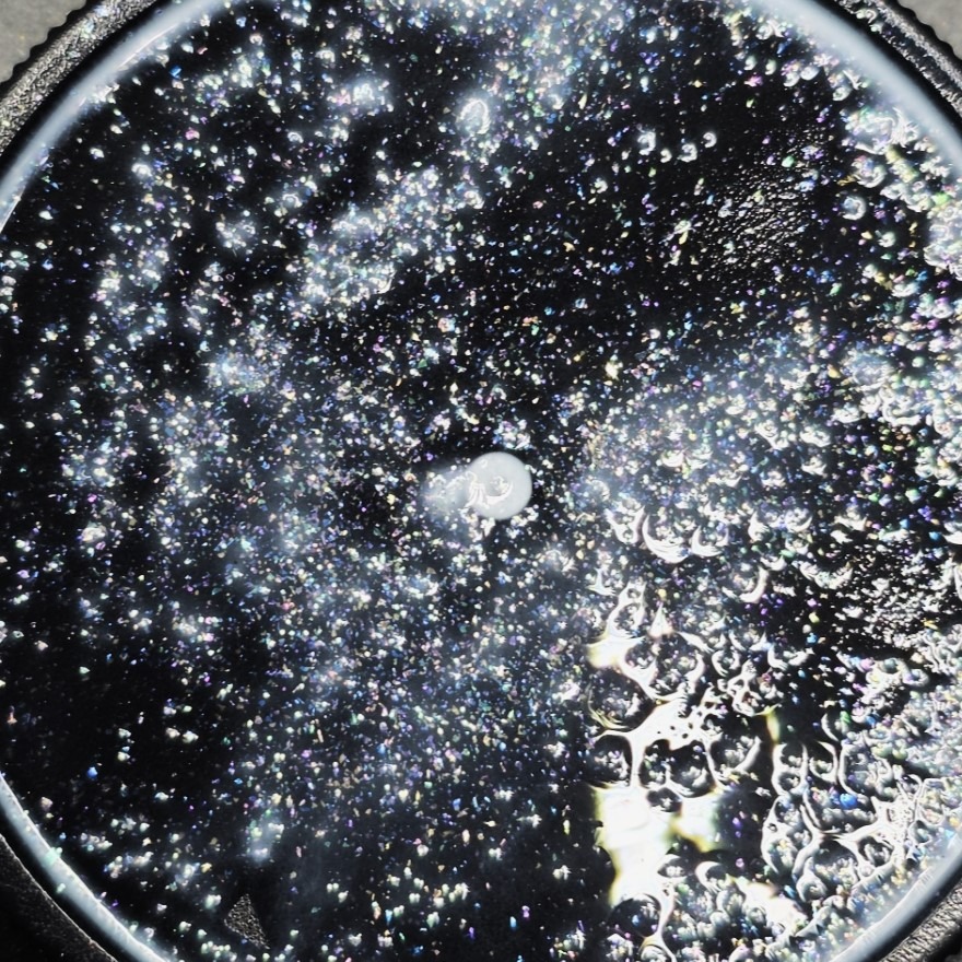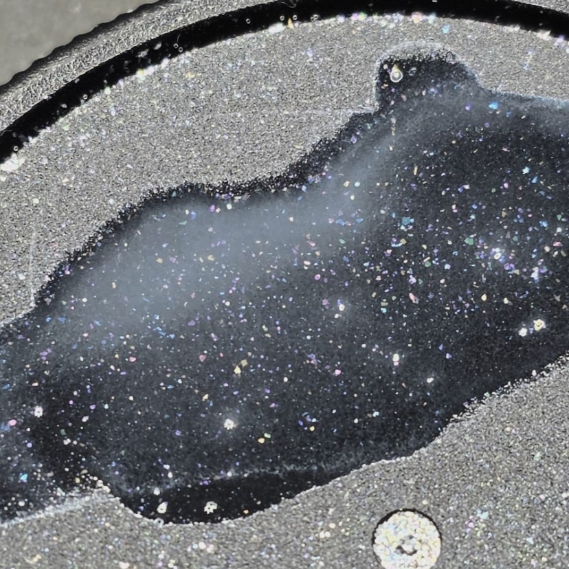 Sheer white ink with added twinkle of pale rainbow colors.