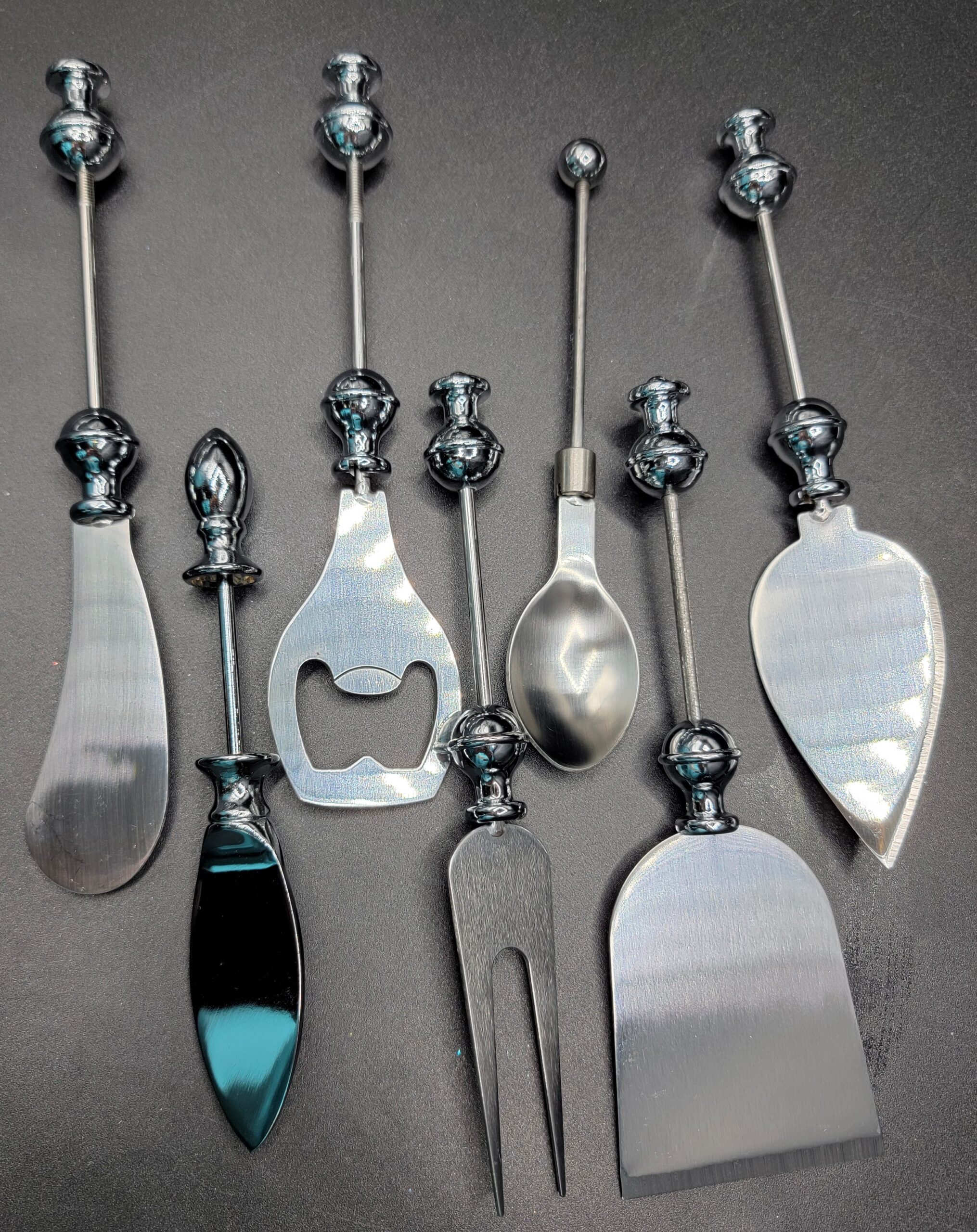 Silver tone metal, ends are removeable to add your seasonal silcon focals and beads. Remove beads and Handwash. Elevate your boards.