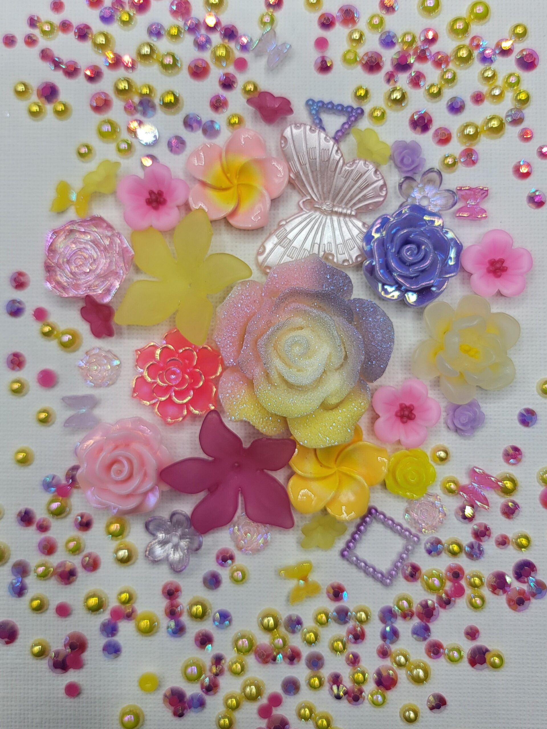 Packets can contain. Acrylic, Resin, Glass, Metal or Clay 3D elements and stones.