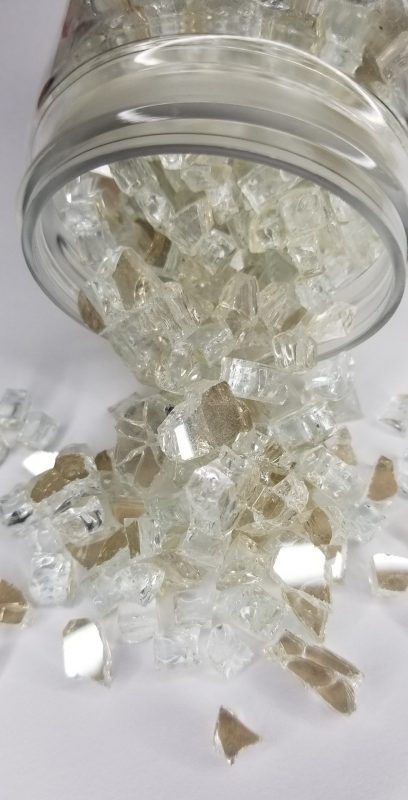 Clear glass chunks with a “platinum” reflective coating on one side.