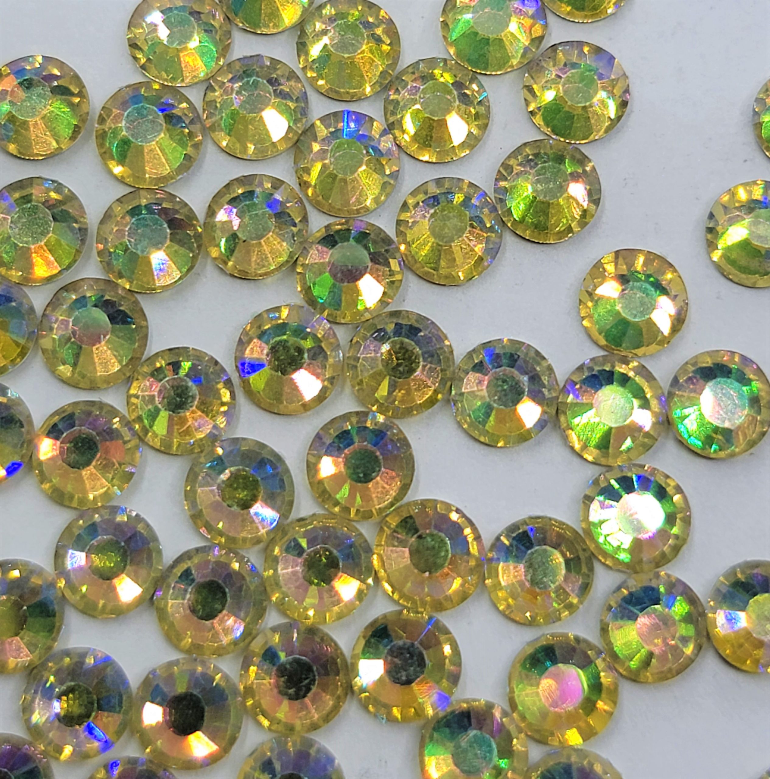 Glass, 1440 stones/pkg. Sunny Yellow stones with AB coating makes them flash blue and green.