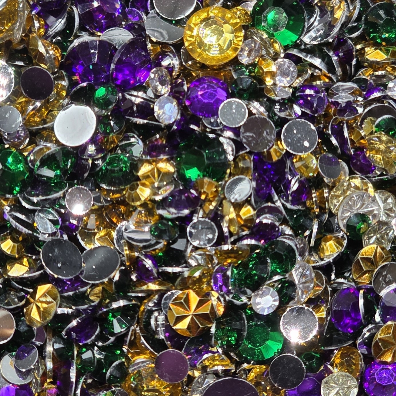 All resin stones, NO pearls in this traditonally colored Mardi Gras mix. Gold, Green and Purple.