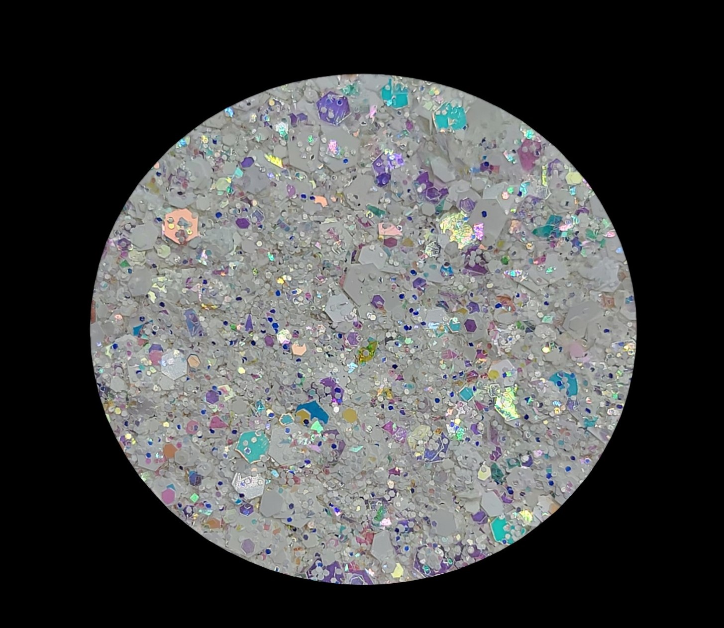 Custom chunky mix, opaque iridescent white with shifts of blue and pink, blended with opal white.